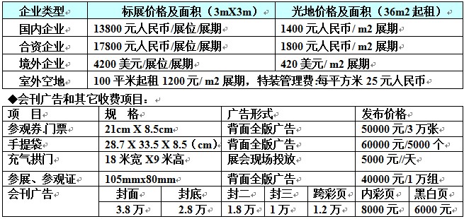 標準展位費用包括:展出場地、2.5高壁板、楣牌制作、9平方米地毯、洽談桌一張、二把椅子、5A/220 V單相電源插座一個、日光燈二支。參展企業若選擇雙開口展位加收10%的費用,三開口展位加收15%的費用,光地費用包括:展出場地、保安、清潔服務(不包括特裝管理費)。特裝管理費:每平方米28元人民幣。
