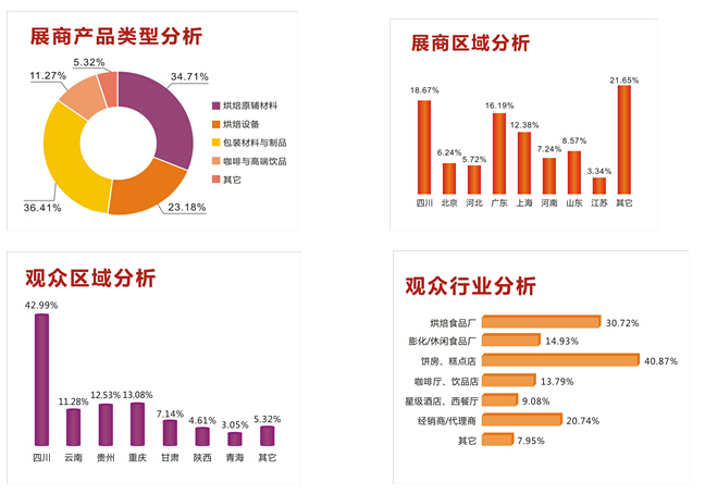 其它:展示柜、儲藏與冷藏柜、面包貨架,仿真模型,店面裝飾,管理軟件,家用烘焙原輔材料、設備、烤箱、模具、包裝等,培訓機構,烘焙書刊。