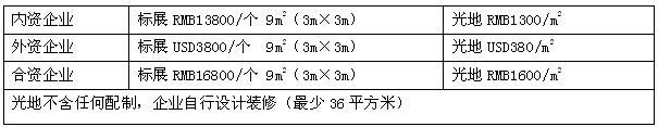 9㎡標準展位收費(包括:展出場地, 2.5m高壁板  一條中英文楣板、洽談桌一張、二把椅子、220V電源插座、射燈二支、展位內滿鋪地毯;注:雙開口展位加20%費用;)
