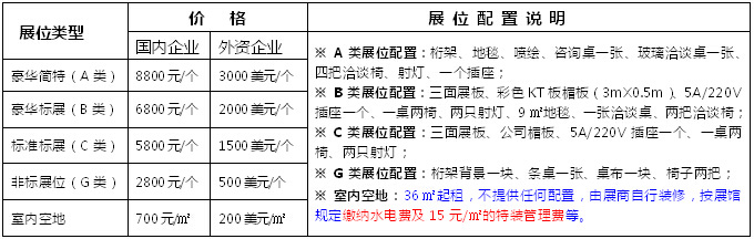 1、展位費用:(標準展位3米*3米=9平米,雙開口展位另加收1000元人民幣)