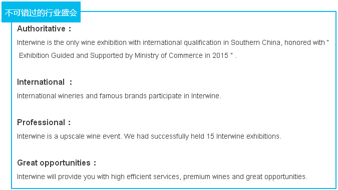 The 16th Interwine, organized by Canton Universal Fair Group Ltd., will be held in China Import & Export Fair Complex, Area B during May 20th to 22nd, with an exhibiting area of 30,000sqm. During the fair, wineries from 72 countries around the world, wine importers, wine distributors, foreign consulates in Guangzhou, leading wine enterprises and media will hold various kinds of forums, wine tasting events, and master classes to spread wine culture and promote the development of wine industry.
