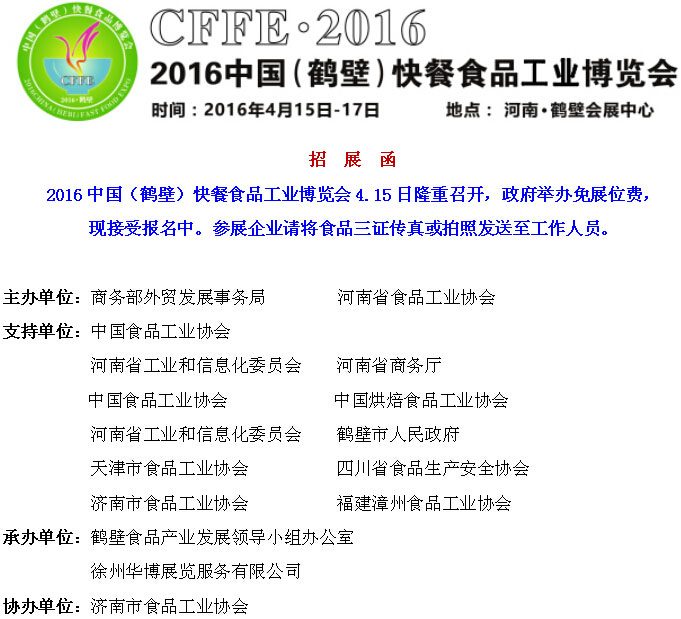 由商務部外貿發展局、河南省食品工業協會聯合主辦的2015首屆鶴壁快餐食品博覽會于2015年4月10日至12日在鶴壁會展中心成功舉辦。作為晉冀魯豫4省經濟協作區首個食品類展會,據統計,首屆食博會吸引了全國26個省(區)的652家企業參展,其中特裝企業54家、標展企業598家;13個項目簽約,總投資約75.7億元;到會的參展商、經銷商、采購商、投資商近萬人,參觀群眾近10萬人次,現場及合同交易額30多億元。