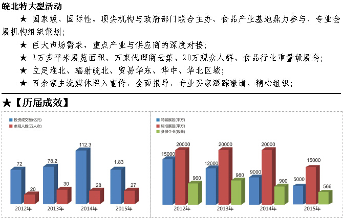 2015年第四屆:2015年4月24-26日在淮北市體育中心召開第四屆食博會,本屆食博會公司以市場化運作的方式籌辦,總展覽面積達23000㎡,共設置三大展區,特裝展區面積5000㎡,標準展區15000㎡,廣場展區3000㎡。
