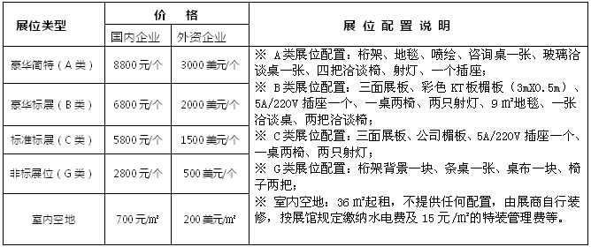 1、展位費(fèi)用:(標(biāo)準(zhǔn)展位3米*3米=9平米,雙開(kāi)口展位另加收1000元人民幣)