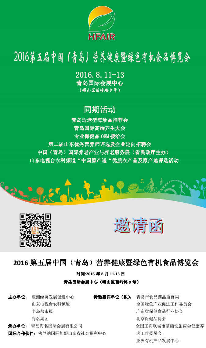 2016第五屆中國(青島)營養健康綠色有機食品博覽會以“健康感動生命——Health for life”為主題、打造綠色健康為宗旨,得到了相關權威部門和業界的大力支持。青島天然綠色及有機食品展會為生產商與經銷商、貿易商及終端客戶提供便捷的交流平臺,是廠家打開國內外市場,展示推廣新產品、交流新技術的品牌盛會!海名會展致力于有機食品展會10年,豐富的經驗、專業的運作團隊、龐大的數據資源等,能為您在華東地區品牌宣傳、開拓市場、產品推廣、商貿洽談等各方面提供最強有力的幫助。