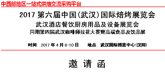 第六屆武漢國際焙烤展覽會將于2017年4月8-10日在武漢國際博覽中心集聚國內外烘焙、餐飲、設備、原料、包裝及行業新動態,分享新設備、新原料、新技術、新產品、新包裝、新概念,給華中烘焙食品帶來新商機直面終端市場,打造人心所向的一站式平臺。