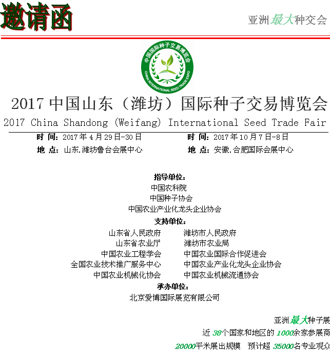 隨著一帶一路戰略大幕的拉開,作為我國農業大省山東位于中國農業重要核心區,山東具有得天獨厚的地緣優勢,勢必將掀起農業大發展.濰坊種交會專業專注種子市場,匯聚一站式種業上下游資源,成為集規模化、品牌化、專業化、多元化、國際化、集群化、前瞻化七大亮點于一身的品牌盛典。展會以種業市場需求為導向,精準把握種業發展趨勢,形成品牌與代理集群的優勢效應,是行業人士捕捉國內外采購商需求,尋找新合作伙伴的首選平臺。展會由北京愛博國際展覽有限公司獨家承辦。2017中國山東(濰坊)國際種子交易博覽會將于2017年4月29-30日在山東.濰坊魯臺國際會展中心盛大開幕,此次展會展出使用面積20000平米,預計參展商家1000家,采購商達35000人次,屆時歡迎參觀參展。