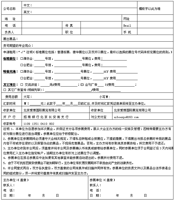 3.參展單位在選定展位后請認真填寫《參展申請及合約表》,加蓋公章后傳真或電郵至大會組委會。
