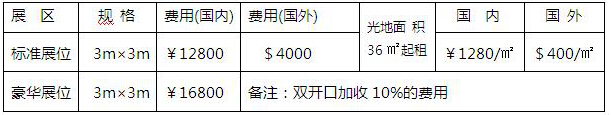 注:標準展位包括地毯、三面圍板、公司名稱楣板、咨詢桌一張、折椅兩把、射燈兩盞、電源插座一個(特殊用電請事先說明,另行收費)。