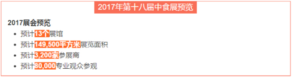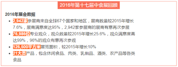 無論在規模還是展會質量上,中食展都已毫無疑問的發展成為亞洲最大創新食品展。2017年,中食展將再接再厲,攜手廣大新老展商、觀眾、媒體及合作伙伴,繼續創造更多的輝煌、更大的成就。