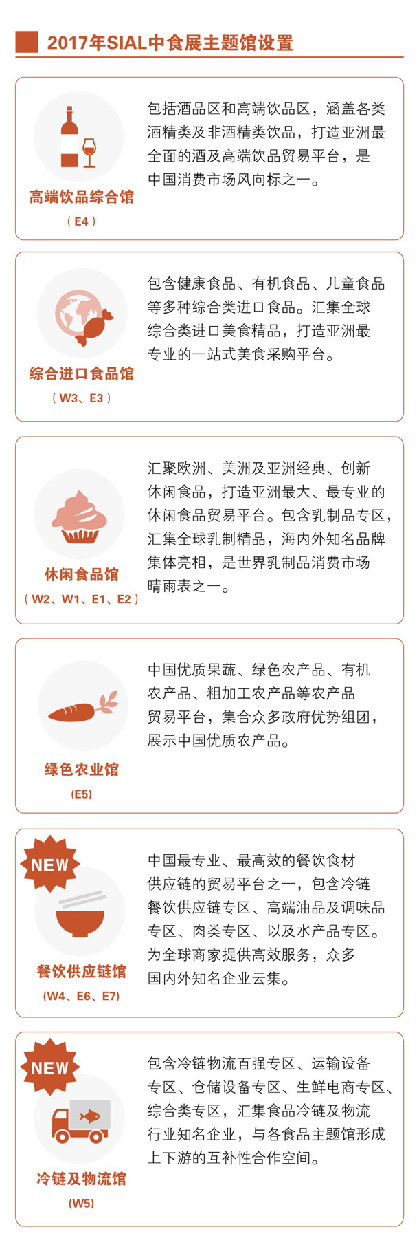 隨著展會規模的進一步擴大,中食展主題館也將進一步升級,2017年將設立6大主題館,不僅在展品范圍上更加全面,還與食品上下游產業相互關聯,形成供應鏈,使中食展逐步發展成為一個貫穿食品行業全產業鏈的食品商務平臺。