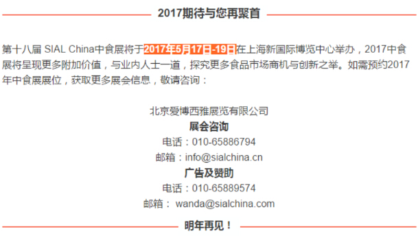 2017期待與您再聚首第十八屆 SIAL China中食展將于2017年5月17日-19日在上海新國際博覽中心舉辦,2017中食展將呈現更多附加價值,與業內人士一道,探究更多食品市場商機與創新之舉。如需預約2017年中食展展位,獲取更多展會信息,敬請咨詢: