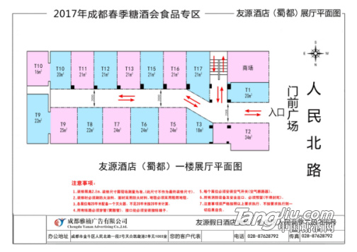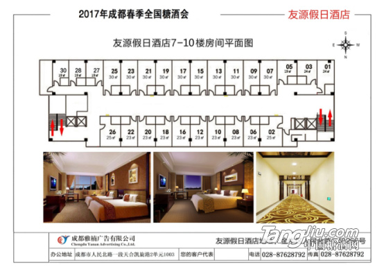 成都友源假日酒店總高11層,1至6樓為展廳,7至11樓為房間。低樓層展廳開闊無阻,滿足大中小企業的需求,便于參展企業形象搭建。房間一字型通道,是商家選擇布展的最佳格局,也是眾多食品的首選,友源假日酒店與成都大酒店遙遙相對,是火車站食品專區的首選地之一。