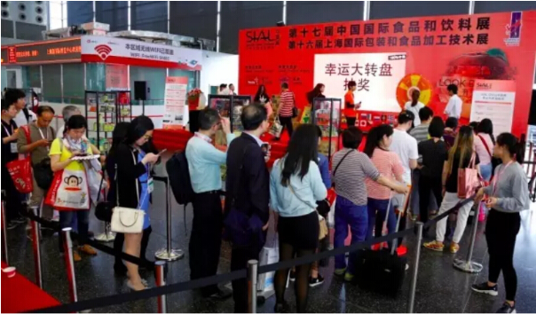 2016年第十七屆China SIAL中食展期間,在展館入口處的幸運大轉(zhuǎn)盤活動區(qū)域人潮攢動熱鬧非凡。