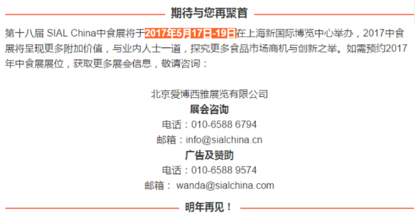怎么樣,看完以上的現(xiàn)場活動回顧,大家更期待今年的中食展開展了吧?那就請繼續(xù)關(guān)注SIAL China中食展的官方賬號,繼續(xù)關(guān)注我們,讓我們一起期待2017年5月17日-19日第十八屆中食展再次開展吧!