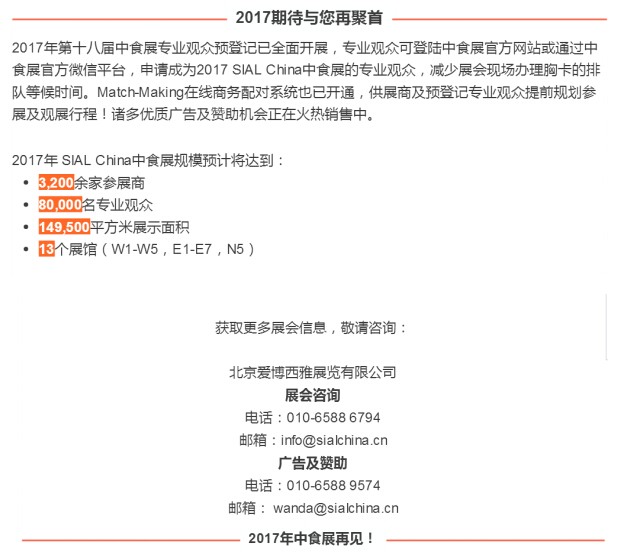 這么多誘人的活動,心動的朋友們速速行動起來報名參加今年5月17日-19日在上海新國際博覽中心舉辦的第十八屆中食展吧!