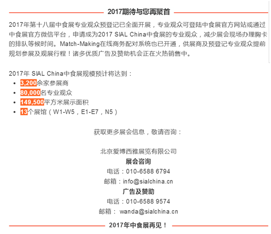 2017年,是農業部對外經濟合作中心第13次作為中國國際食品和飲料展覽會(SIAL China)首席合作單位組團參展,展位面積再創歷史新高,將達到900平米,位于政府機構組團單位前列。