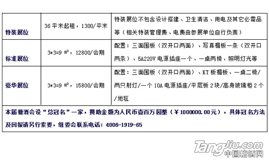本屆糖酒會(huì)設(shè)“總冠名”一家,贊助金額為人民幣壹百萬(wàn)園整(¥1000000.00元),具體冠名方法及回報(bào)請(qǐng)另行索要,組委會(huì)聯(lián)系電話:4006-1919-65