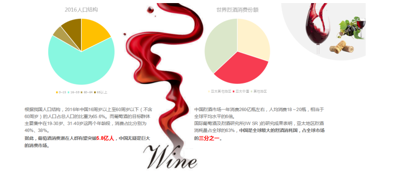 2016年,中國葡萄酒的市場規模達到1555.89億元,同比增長8.64%;烈酒據海關數據統計,我國烈酒進口量為3589萬升,進口額為5.1億美元。上海是全球著名的金融中心,被全球有發展的世界一線城市,有著雄厚的行業產業基礎和龐大的消費市場,上海人均消費總額10946.57億元。上海這個國際都市華都市,經濟輻射廣闊,商務活動繁盛,是各種企業在中國市場布局的必爭之地。