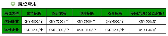 注:A. 標準展位:三面展板(高2.5米),中文楣板、咨詢桌一張、折椅兩把、射燈兩支及5A/220V插座。