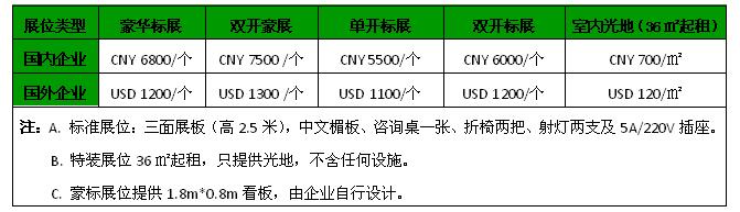 注:A. 標準展位:三面展板(高2.5米),中文楣板、咨詢桌一張、折椅兩把、射燈兩支及5A/220V插座。
