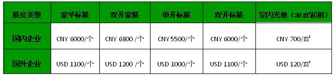 注:A.標準展位:三面展板(高2.5米),中文楣板、咨詢桌一張、折椅兩把、射燈兩支及5A/220V插座。