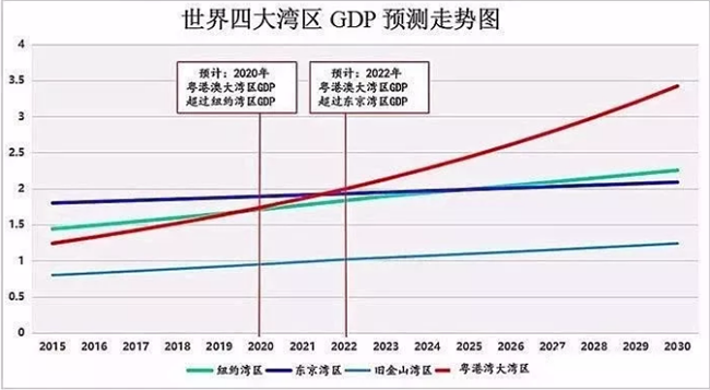 環顧全球,不論經濟總量還是人口數量,粵港澳都堪稱"富可敵囯"。以此發展趨勢計算,中國灣區經濟——粵港澳大灣區將為推行灣區經濟帶來新契機,僅需5年就可成為世界灣區,躋身世界前列。