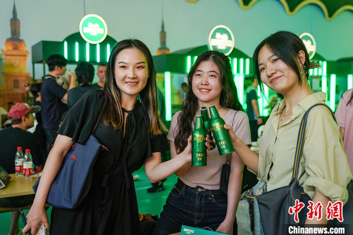 7月20日,黑龍江哈爾濱,游客在啤酒節現場合照。當日,第二十一屆中國·哈爾濱國際啤酒節在哈爾濱冰雪大世界啟幕。 趙宇航 攝