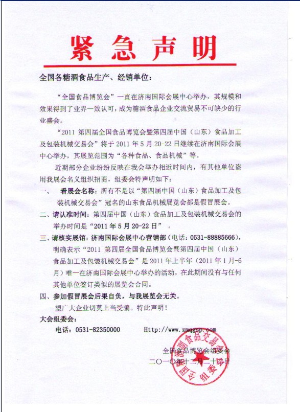 全國食品博覽會(huì)組委會(huì)緊急聲明