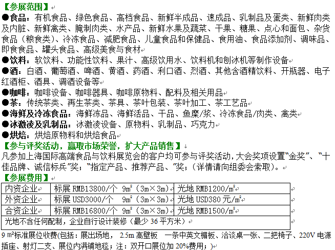 上海高端食品與飲料展以酒店、餐廳、酒吧、咖啡館、會所、商鋪及其它商業(yè)空間為目標群體,專門打造了一個食品與飲料,咖啡與茶等高級食品食材的一站式供貨和解決方案的專業(yè)展會,將為食品展商提供一個近超過10萬名買家的酒店餐飲業(yè)一站式采購平臺。