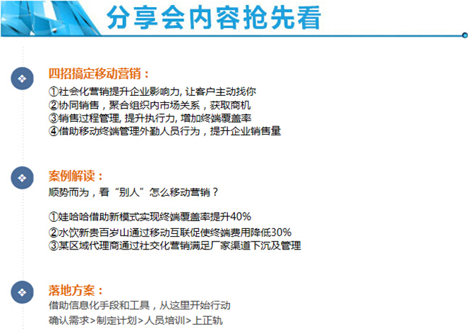 本次活動將全方位分享新型市場環境下“如何低成本、高效率地獲取客戶”、“如何聚合組織內市場關系來獲得商機”、“如何進行有效的銷售過程管理進而提高商機轉化率”,直擊快消企業切身之痛,用專業實用的理論和優秀的實踐案例分享,讓企業掌握移動互聯下的銷售新玩法,從而輕松從白熱化的市場競爭中突圍。
