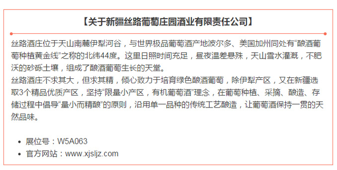 今年,絲路酒莊也會參加2016第十七屆中食展,帶著他最以為傲的葡萄酒系列產(chǎn)品在酒類綜合館進行展出,有幸可以參展的朋友們千萬不要錯過,到展會現(xiàn)場絲路酒莊的展位去品一品來自新疆的美酒。