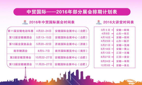 據了解,2016年度,中貿國際三地糖酒會一共安排四場頗具規模的大型展覽總展出面積將超過12萬平方米,并且,2016年我們將更加大力的推動的有10場地級市的小型巡講(即糖酒食品經銷商公益大講堂)預計將帶動100家企業在華東地區與10000家經銷商獨立性接觸,這是中貿國際的首創模式,這些都將成為廣大廠企選擇中貿的優勢之一。