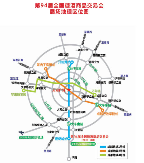 路線指引:成都地鐵1號線(由成都市中心乘坐地鐵1號線到達世紀城站經由C出口,即可到達成都糖酒會主會場-世紀城新會展)