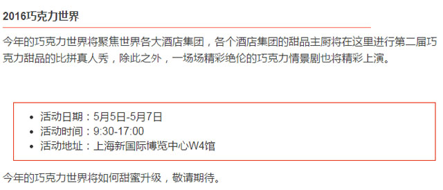2015年,第四屆巧克力世界活動歷時3天,精選4家贊助商,成功舉辦了14場活動,吸引了550多名專業觀眾。