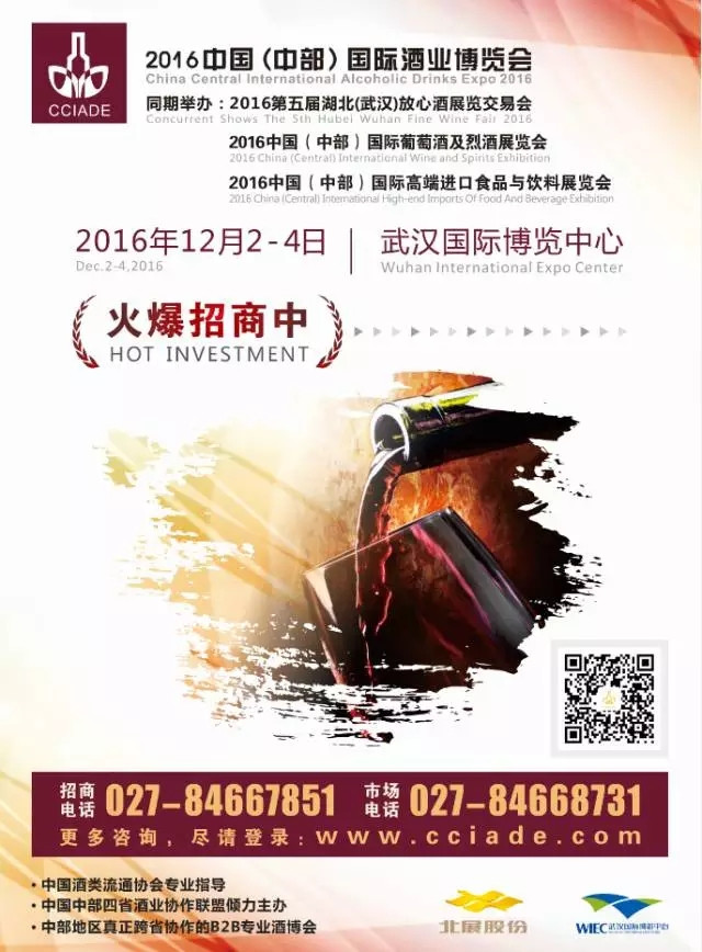 2016中國(中部)國際酒博會將在12月2-4日在武漢國際博覽中心舉辦,同期還將舉辦2016中國(中部)國際高端進口食品與飲料展覽會,歡迎業界人士洽談咨詢。