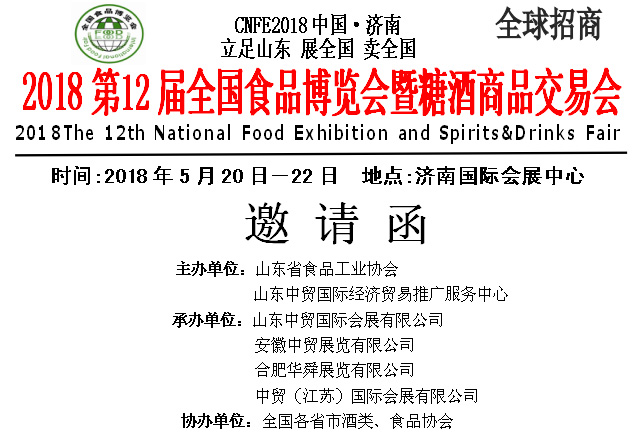 為推動中國糖酒食品行業快速發展,2018年5月20日繼續在濟南國際會展中心舉辦“2018第12屆全國食品博覽會暨糖酒商品交易會”,本屆交易會不論規模和檔次都將突破歷屆之最,歡迎廣大廠商前來參展、參觀!