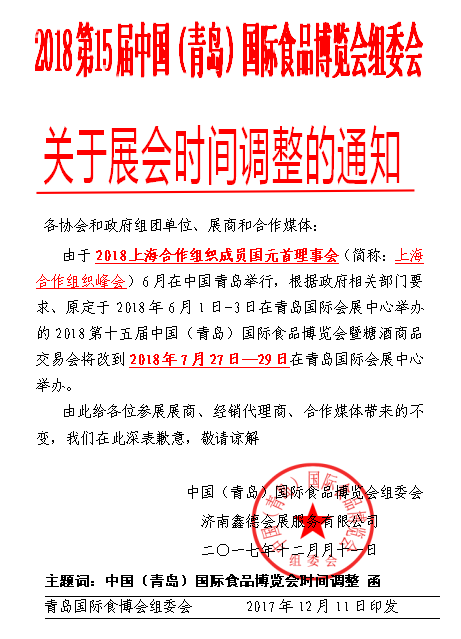 首頁展會資訊展會追蹤 展會追蹤 展會時間調整的通知--2018第15屆中國(青島)國際食品博覽會組委 未知 2017-12-11 17:18 展會追蹤 < 上一篇2018第十五屆中國(青島)國際糖酒食品博覽會2018第十五屆中國(青島)國際糖酒食品博覽會 同期召開:山東冷凍冷藏及餐飲市場博覽會 時間:2018年6月1日 上一篇2018【匯成】第21屆河北省糖酒食品交易會2018【匯成】第21屆河北省糖酒食品交易會 邀 請 函 大巴車免費接送經銷商,效果有保證 展會時間: 2018年5 相關文章 開局即沖刺!第32屆鄭州糖酒食品交易會全面啟動招展,預定已過半! 2023第十六屆中國(山東)國際糖酒食品交易會邀請函 SIAL國際食品展(上海) 2021國際葡萄酒烈酒博覽會12月規模升級,體驗全球美酒魅力 關于“第十七屆中國國際酒業博覽會”延期舉辦 2019第十六屆中國(青島)國際糖酒食品博覽會盛大啟航 2019第十七屆西安年貨會 第六屆中國(重慶)糧油食品博覽會暨迎春年貨節邀請函 第99屆全國糖酒會將亮相長沙國際會展中心 瑞城傳媒集團2019年春季邀請函