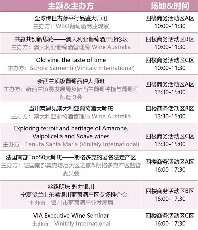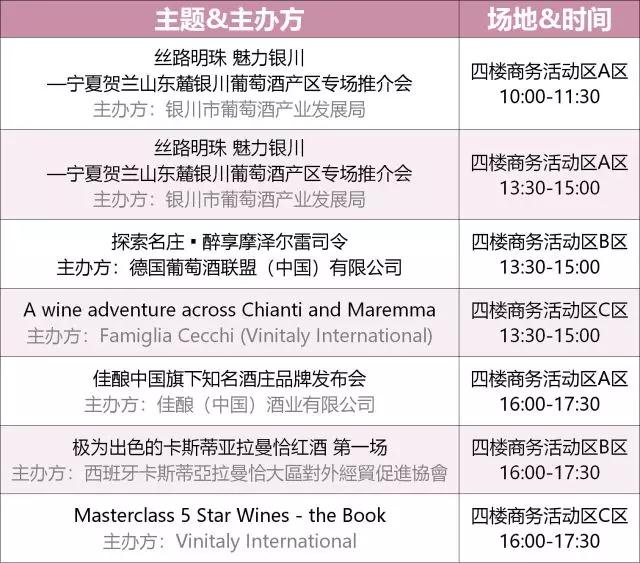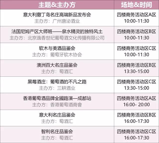 國家產區協會代表、成都各外國領事代表、酒業“大佬”(名企老板)、行業權威(如James Halliday)、MW(Master of Wine 葡萄酒大師)如趙鳳儀、MS(Master of Sommelier 侍酒大師)如首位華人MS呂楊、知名講師如小皮、朱利安、劉慧、許鐵松等紛紛出動,助陣32場主題活動,4天變著花樣取悅你,來四樓收獲最新的國際行業信息,最豐富深刻的葡萄酒及烈酒專業知識。